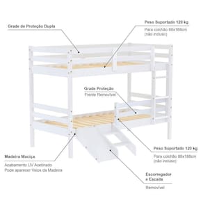 Material Principal: Madeira | Cor Predominante: Branco | Necessita Montagem: Sim | Acompanha Colchão: Não | Tamanho da Cama: 88 | Tipo de Cama: Beliche | Altura: 148 | Largura: 96,6 | Peso máximo suportado: 120 | Peso: 49 | Comprimento: 199 | Cor Via: Branco | Altura com Embalagem: 148 | Largura com Embalagem: 96,6 | Comprimento com Embalagem: 199 | Peso com Embalagem: 49 | Descrição do Tamanho: 148 x 96,6 x 199
