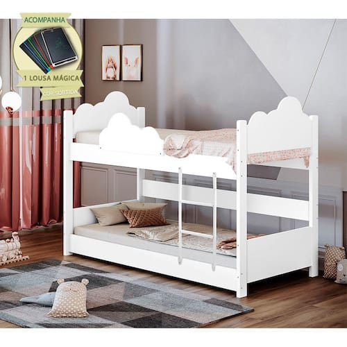 A Beliche Solteiro Erika proporciona para o quarto um toque de delicadeza, requinte e conforto. Além de decorar ainda mais o ambiente, ela traz diversão e alta segurança pois é feita em MDF, material resistente e de qualidade.Tipo: Beliche SolteiroModelo: ErikaCor: Branco Garantia: 90 diasProduto DesmontadoMaterial 100% MDFPés em madeira maciçaPintura UV Verniz BrilhoNão acompanha colchãoItens inclusos:Kit de montagemManual de montagemGrade de proteçãoLousa mágica (Produto Ecológico, Salva 3 Árvores, para o Desenvolvimento, Botão para Limpar, Bateria Média 2 Anos)Medidas:Altura: 124cmLargura: 94cmComprimento: 194cmATENÇÃOIMAGENS MERAMENTE ILUSTRATIVAS REALIZADO EDIÇÃO, PODENDO HAVER UMA PEQUENA VARIAÇÃO DE COR DEPENDENDO DE CADA TELA OU MONITOR. Marca: BABY MOBILIA