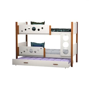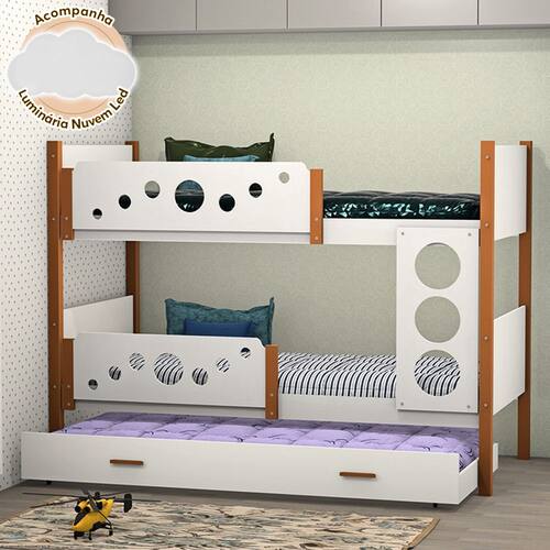 Beliche Solteiro Star Com Cama Auxiliar Branco Com Castanho Claro Acompanha Luminária Nuvem