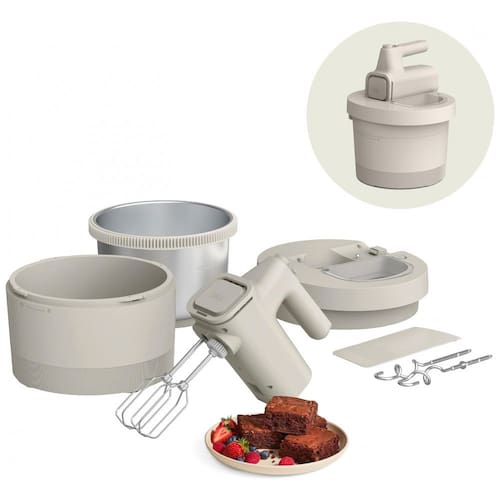 A batedeira elétrica BELLA Hand & Stand 3,3L combina modo de uso sobre base e modo portátil, permitindo bater massas leves e pesadas em tigela de 3,3 litros. A estrutura inclui tigela em aço inox e tigela plástica, ambas removíveis e compatíveis com lava-louças, otimizando o preparo contínuo de receitas e a limpeza após o uso.
