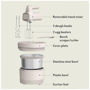 Conteúdo da embalagem: 1 batedeira BELLA Hand & Stand 3,3L, 2 tigelas (inox e plástica), conjunto de batedores, ganchos para massa, tampa/capa multifuncional