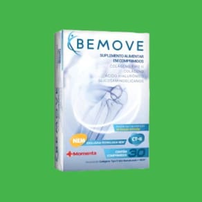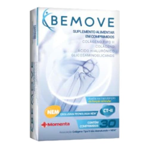 Bemove Colágeno Tipo 2 Acido Hialurônico 30 Comprimidos BEMOVE é uma associação de colágeno tipo II não desnaturado com o extrato liofilizado da membrana interna da casca do ovo NEM que disponibiliza elementos importantes encontrados em vários tecidos do nosso organismo como pele, tendões, cartilagem e ossos. Bemove auxilia na manutenção da função articular. Produto isento de registro conforme a RDC 27/2010