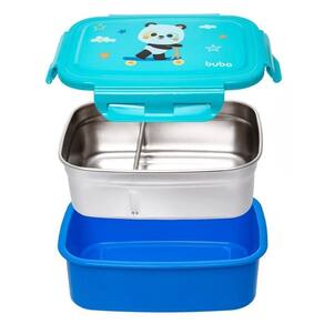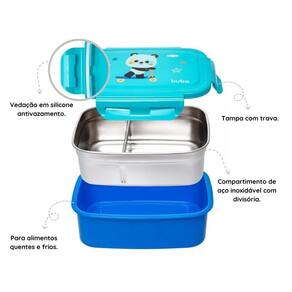 Características Técnicas: Idade recomendada: 1 a 4 anos Capacidade: 600 ml Cor predominante: azul Composição do produto: Pote: 100% PP Vedação: 100% Silicone Interior: Aço Inoxidável 304 Com divisória ajustável e removível Tampa com vedação em silicone antivazamento Para alimentos quentes e frios Compartimento interno de aço inoxidável Atóxico, higiênico e livre de BPA