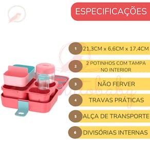 Conteúdo do Conjunto: 1 lancheira, 1 pote de comida (227g), 2 divisores de armazenamento, 1 pote de condimento (57g) com tampa de encaixe.