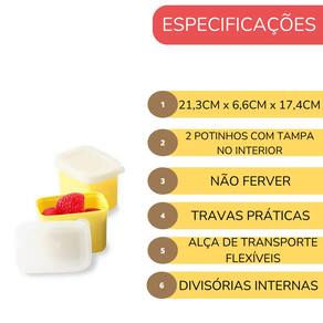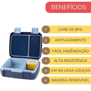 Diferenciais que Fazem a Diferença: Livre de BPA: Segurança em primeiro lugar. Nossos materiais são livres de BPA, garantindo a saúde e bem-estar do seu filho. Alça de Transporte Flexível: Fácil de carregar, perfeita para as pequenas mãos das crianças. Design Moderno e Atraente: A linha Spark Style encanta com cores vibrantes e um design que os pequenos adoram. Ficha Técnica: Idade Indicativa: +3 anos Vedação Segura: Sim Fechos: Fáceis de abrir e fechar Bandeja Interna Removível: Sim Alça de Transporte Flexível: Sim Lavável na Lava-Louças: Sim (somente na parte superior) Livre de BPA: Sim Medidas: 21,33cm x 6,65cm x 17,42cm Instruções de Limpeza e Manutenção: Lancheira, Bandeja e Recipientes Bento: Laváveis na prateleira superior da lava-louças. Micro-ondas: Não pode ser usada no micro-ondas. Fervura: Não ferva a lancheira. Anel de Silicone: Removível para limpeza.