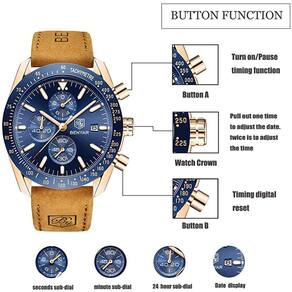 COMPOSIÇÃO DO RELÓGIO MATERRIAL:Movimento de quartzo de precisão, vidro mineral à prova de arranhões, estrutura metálica de alta qualidade e banda de couro.USO DIÁRIO: 30M à prova d'água e exibição de data, Sub-discagem de três cronógrafos, sub-discagem de 1/10 segundos, Sub-discagem de segundos e sub-discagem de minuto.Fácil de operar, intuitivo de assistir. MANUTENÇÃO PRECISA DO TEMPO: Movimento de quartzo, Fornecer manutenção de tempo precisa e precisa. ESTILO CLÁSSICO: alça de couro com mostrador clássico. Adequado para participar de várias ocasiões. Também é um bom Natal, Dia dos Namorados, casamento, presente de aniversário. EMBALAGEM E GARANTIA: Assista * 1. Caixa de relógio * 1. Manual de Instruções * 1. Cartão de garantia * 1 . Retorno incondicional dentro de 30 dias.