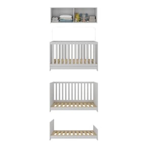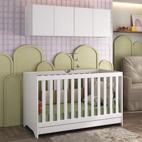 O Berço 3 em 1 com Colchão e Armário Aéreo 4 portas Multimóveis MP4158 é produzido em MDP com acabamento acetinado (cerca de 20% de brilho), garantindo durabilidade e resistência. O berço se transforma em sofá e minicama, acompanhando o crescimento do seu filho, possui 3 regulagens de altura para o colchão e acompanha suporte para mosquiteiro, que garante noites mais tranquilas de sono para o bebê. A grade Soft (PVC) é produzida de maneira ecologicamente correta, com matéria-prima livre de metais pesados, atóxica e com proteção anti-amarelamento. Berço certificado pelo INMETRO sob o selo n 0000085/2018. O colchão possui estrutura em espuma e tecido poliéster e um dos lados é impermeável. De conforto macio, possui tratamento anti-ácaro e anti-alérgico e é indicado para até 50kg. Com design moderno, o armário aéreo possui 4 portas com amplo espaço interno para organizar os objetos do bebê, suportando até 6kg em cada prateleira.