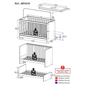 Especificações técnicas: Berço - Altura: 80,5cm | Largura: 133cm | Profundidade: 66cm Colchão - Altura: 10cm | Largura: 130cm | Profundidade: 60cm Material: MDP com grades soft (PVC) Regulagem de altura: 3 níveis Suporte para mosquiteiro: Sim Colchão incluso: Sim, tamanho 130x60cm Certificado pelo Inmetro: Sim (Selo n 0000085/2018)