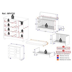 Dimensões do Produto Montado: Berço - Altura: 80,5cm | Largura: 133cm | Profundidade: 66cm Colchão - Altura: 10cm | Largura: 130cm | Profundidade: 60cm Cômoda - Altura: 88cm | Largura: 95cm | Profundidade: 42cm *Você pode consultar as medidas detalhadas na imagem técnica do produto.