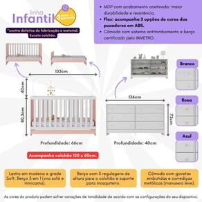 O conjunto é produzido em MDP (12/15mm) com acabamento acetinado (cerca de 20% de brilho), combinando beleza e resistência. Para tornar as noites de sono do pequeno tranquilas, o berço suporta até 35kg (50kg como minicama ou sofá). 3 em 1, transforma-se facilmente em sofá e minicama, acompanhando o crescimento da criança de maneira confortável e divertida. Para um sono saudável, acompanha colchão D18 com tratamento antiácaro, antialérgico e impermeável em um dos lados.