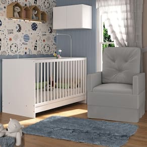 O Berço 3 em 1 com Colchão Poltrona e Armário Aéreo 2 Portas Multimóveis MP4156 é perfeito para proporcionar conforto ao seu pequeno. O berço e o armário aéreo são produzidos em MDP com acabamento acetinado (cerca de 20% de brilho), garantindo durabilidade e resistência. O berço é padrão nacional (tamanho do colchão 1,30 x 0,60), se transforma em sofá e minicama, acompanhando o crescimento do seu filho, possui 3 regulagens de altura para o colchão e acompanha suporte para mosquiteiro, garantindo noites mais tranquilas de sono para o bebê. As grades em MDF/madeira maciça de pinus garantem maior estabilidade e segurança para o bebê. Selo de certificação do INMETRO: 0000085/2018. Acompanha colchão (suporta até 50kg) em espuma revestido com tecido poliéster, que possui conforto macio e tratamento anti-ácaro e anti-alérgico. A poltrona de amamentação (suporta até 110kg) é produzida em madeira de eucalipto e espuma densidade D23 com molas reforçadas e mecanismo de balanço. As poltronas nas cores cinza e bege possuem acabamento em tecido veludo. Poltrona na cor branca possui acabamento em material sintético. O armário aéreo possui 2 portas e suporta até 6kg em seu interior.