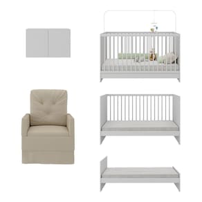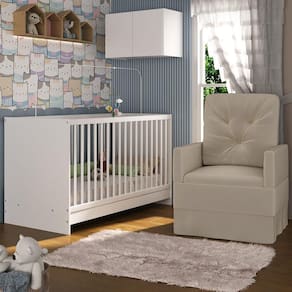 O Berço 3 em 1 com Colchão Poltrona e Armário Aéreo 2 Portas Multimóveis MP4156 é perfeito para proporcionar conforto ao seu pequeno. O berço e o armário aéreo são produzidos em MDP com acabamento acetinado (cerca de 20% de brilho), garantindo durabilidade e resistência. O berço é padrão nacional (tamanho do colchão 1,30 x 0,60), se transforma em sofá e minicama, acompanhando o crescimento do seu filho, possui 3 regulagens de altura para o colchão e acompanha suporte para mosquiteiro, garantindo noites mais tranquilas de sono para o bebê. As grades em MDF/madeira maciça de pinus garantem maior estabilidade e segurança para o bebê. Selo de certificação do INMETRO: 0000085/2018. Acompanha colchão (suporta até 50kg) em espuma revestido com tecido poliéster, que possui conforto macio e tratamento anti-ácaro e anti-alérgico. A poltrona de amamentação (suporta até 110kg) é produzida em madeira de eucalipto e espuma densidade D23 com molas reforçadas e mecanismo de balanço. As poltronas nas cores cinza e bege possuem acabamento em tecido veludo. Poltrona na cor branca possui acabamento em material sintético. O armário aéreo possui 2 portas e suporta até 6kg em seu interior.