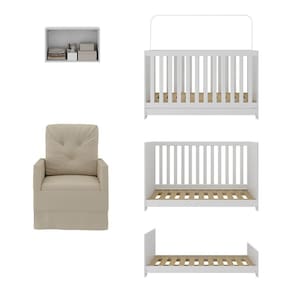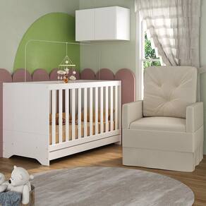 O Berço 3 em 1 com Colchão Poltrona e Armário Aéreo 2 Portas Multimóveis MP4165 é perfeito para proporcionar conforto ao seu pequeno. O berço e o armário aéreo são produzidos em MDP com acabamento acetinado (cerca de 20% de brilho), garantindo durabilidade e resistência. O berço se transforma em sofá e minicama, acompanhando o crescimento do seu filho, possui 3 regulagens de altura para o colchão e acompanha suporte para mosquiteiro, garantindo noites mais tranquilas de sono para o bebê. A grade Soft (PVC) é produzida de maneira ecologicamente correta, com matéria-prima livre de metais pesados, atóxica e com proteção anti-amarelamento. Berço certificado pelo INMETRO sob o selo n 0000085/2018. O colchão possui estrutura em espuma e tecido poliéster e um dos lados é impermeável. De conforto macio, possui tratamento anti-ácaro e anti-alérgico e é indicado para até 50kg. A poltrona de amamentação (suporta até 110kg) é produzida em madeira de eucalipto e espuma densidade D23 com molas reforçadas e mecanismo de balanço. As poltronas nas cores cinza e bege possuem acabamento em tecido veludo. Poltrona na cor branca possui acabamento em material sintético. O armário aéreo possui 2 portas e suporta até 6kg em seu interior.