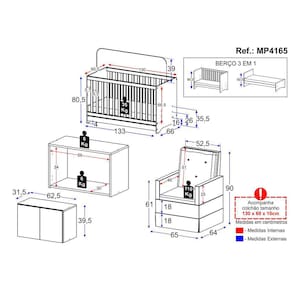 Berço - Altura: 80,5cm | Largura: 133cm | Profundidade: 66cm
