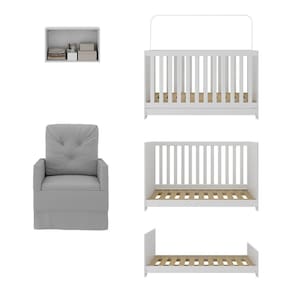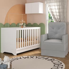 O Berço 3 em 1 com Colchão Poltrona e Armário Aéreo 2 Portas Multimóveis MP4165 é perfeito para proporcionar conforto ao seu pequeno. O berço e o armário aéreo são produzidos em MDP com acabamento acetinado (cerca de 20% de brilho), garantindo durabilidade e resistência. O berço se transforma em sofá e minicama, acompanhando o crescimento do seu filho, possui 3 regulagens de altura para o colchão e acompanha suporte para mosquiteiro, garantindo noites mais tranquilas de sono para o bebê. A grade Soft (PVC) é produzida de maneira ecologicamente correta, com matéria-prima livre de metais pesados, atóxica e com proteção anti-amarelamento. Berço certificado pelo INMETRO sob o selo n 0000085/2018. O colchão possui estrutura em espuma e tecido poliéster e um dos lados é impermeável. De conforto macio, possui tratamento anti-ácaro e anti-alérgico e é indicado para até 50kg. A poltrona de amamentação (suporta até 110kg) é produzida em madeira de eucalipto e espuma densidade D23 com molas reforçadas e mecanismo de balanço. As poltronas nas cores cinza e bege possuem acabamento em tecido veludo. Poltrona na cor branca possui acabamento em material sintético. O armário aéreo possui 2 portas e suporta até 6kg em seu interior.