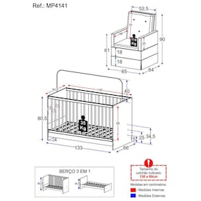 Dimensões do produto montado: Berço - Altura: 80,5cm | Largura: 133cm | Profundidade: 66cm Poltrona - Altura: 90cm | Largura: 65cm | Profundidade: 64cm *Você pode consultar as medidas detalhadas na imagem técnica do produto.