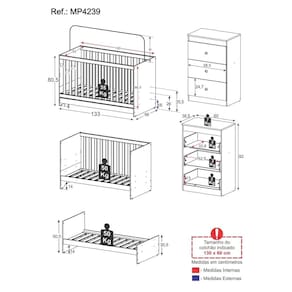 Dimensões do produto montado: Berço - Altura: 80,5cm | Largura: 133cm | Profundidade: 66cm Cômoda - Altura: 92cm | Largura: 60cm | Profundidade: 38,5cm *Você pode consultar as medidas detalhadas na imagem técnica do produto.