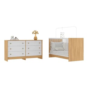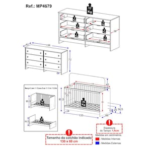 Especificações Técnicas: Dimensões do Berço - Altura: 80,5cm | Largura: 133cm | Profundidade: 66cm Dimensões da Cômoda - Altura: 72cm | Largura: 136cm | Profundidade: 40cm Regulagem de altura: 3 níveis Suporte para mosquiteiro: Sim Rodízios: Sim Colchão incluso: Não, tamanho indicado: 130 x 60cm Certificação INMETRO: Selo n000332/2025