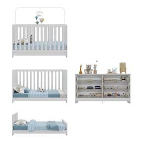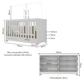 O conjunto é produzido em MDP (12/15mm) com acabamento acetinado (cerca de 20% de brilho), combinando beleza e resistência. Para tornar as noites de sono do pequeno tranquilas, o berço suporta até 35kg (50kg como minicama ou sofá). 3 em 1, o berço transforma-se facilmente em sofá e minicama, acompanhando o crescimento da criança de maneira confortável e diida. NÃO acompanha colchão (tamanho indicado: 130 x 60cm).