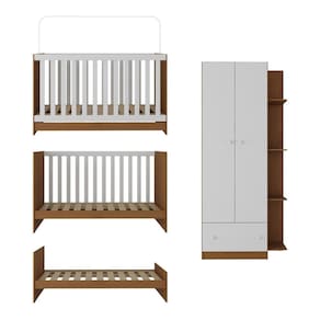 O Berço 3 em 1 para Colchão 130 x 60cm com Guarda-Roupas 2 Portas Doce de Leite Multimóveis MP4241 é fabricado em MDP com acabamento acetinado (cerca de 20% de brilho), garantindo durabilidade e facilidade na limpeza. Com design versátil, o berço (suporta até 35kg) se transforma em minicama e sofá (suporta até 50kg), possui grade Soft (PVC), lastro com 3 regulagens de altura para o colchão e suporte para mosquiteiro, oferecendo noites de sono mais tranquilas e seguras. Certificado pelo INMETRO sob o selo n 0000085/2018. NÃO acompanha colchão (tamanho indicado do colchão: 130 x 60cm). O guarda-roupas conta com puxadores em ABS delicados, 2 portas, dobradiças metálicas, cabideiro que suporta até 3kg e 1 gaveta (suporta até 3kg) com corrediças metálicas, que proporcionam mais leveza no manuseio. Além disso, possui 4 prateleiras externas que suportam até 2kg em cada e são ideais para apoiar objetos decorativos, embelezando o ambiente. Com um design clean e encantador, este kit traz um toque especial ao quarto do bebê, tornando o ambiente mais acolhedor.