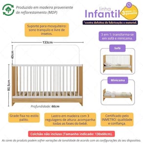 O Berço 3 em 1 para Colchão 60 x 130 cm Multimóveis MP0527G é a escolha ideal para garantir o conforto e do seu bebê. Produzido em MDP com acabamento acetinado (cerca de 20% de brilho), garante durabilidade e resistência. Versátil, o berço se transforma em sofá e minicama, acompanhando o crescimento do seu filho. É padrão (tamanho do colchão 1,30 x 0,60 m), possui 3 regulagens de altura para o colchão e acompanha suporte para mosquiteiro, protegendo o bebê contra insetos indesejados e garantindo noites mais tranquilas. As grades fixas são produzidas em madeira de pinus revestida. O berço é certificado pelo INMETRO sob o Selo n 000332/2025. NÃO acompanha colchão.