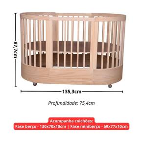 * Produto 3 em 1: miniberço, berço e minicama. * Inclui 2 colchões Ortobom D18 (um para miniberço e outro para berço/minicama). * Estrutura resistente em MDF e madeira maciça de eucalipto. * Acabamento em pintura UV: maior proteção e durabilidade. * 3 regulagens de altura do colchão, adaptando-se ao crescimento do bebê. * Rodízios em silicone gel: fácil movimentação sem danificar o piso. * Certificado pelo INMETRO (Selo n 002114/2018), garantindo segurança e qualidade. * Suporta até 35kg.