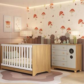 Diferenciais: - 3 anos de garantia contra defeitos de fabricação e material (exceto colchão). - Conjunto produzido em madeira de reflorestamento (MDP 12/15mm) com acabamento acetinado (cerca de 20% de brilho): sustentabilidade e durabilidade. - Berço americano 3 em 1 que se transforma em sofá e minicama, acompanhando o crescimento do bebê. Grade Soft (PVC): ecologicamente correta, com matéria-prima livre de metais pesados, atóxica e com proteção antiamarelamento. - Lastro em madeira com 3 regulagens de altura e suporte para mosquiteiro para noites mais tranquilas e protegidas. - Berço certificado pelo INMETRO (Selo n 000085/2018). - Colchão D18 incluso: possui tratamento antiácaro, antialérgico, antimofo e um dos lados impermeável. - Cômoda com 1 porta, 4 gavetas (frontais em MDF) e pés em polipropileno: amplo espaço interno e elegância. - Sistema antitombamento na cômoda: proporciona segurança para o bebê e tranquilidade aos pais. - Porta com detalhes de vidro incolor temperado (3mm): toque charmoso que permite visualizar o interior do móvel. - Corrediças telescópicas: abertura total e silenciosa das gavetas. - Cabideiro de alumínio: permite acomodar as roupinhas para que não amassem. - Puxadores em ABS delicados e práticos.