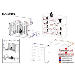 Dimensões do Produto Montado: Berço - Altura: 80,5cm | Largura: 133cm | Profundidade: 77,5cm Colchão - Altura: 10cm | Largura: 130cm | Profundidade: 70cm Cômoda - Altura: 88cm | Largura: 95cm | Profundidade: 42cm *Você pode consultar as medidas detalhadas na imagem técnica do produto.