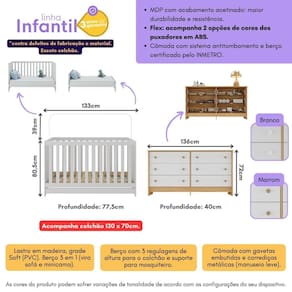 Versatilidade e durabilidade: O conjunto é produzido em MDP (12/15mm) com acabamento acetinado (cerca de 20% de brilho), combinando beleza e resistência. Para tornar as noites de sono do pequeno tranquilas, o berço no padrão americano suporta até 35kg (50kg como minicama ou sofá). Acompanha colchão de espuma D18 com tratamento antiácaro, antialérgico, antimofo e um dos lados impermeável. Berço certificado pelo INMETRO sob o selo n 0000085/2018.