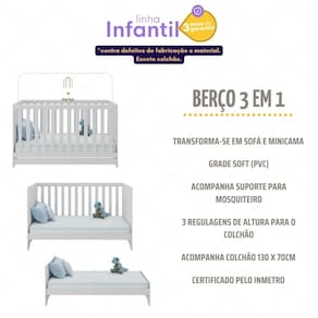 Diferenciais: - Produzido em madeira de reflorestamento (MDP 12/15mm): garante durabilidade e resistência. - Acabamento acetinado (cerca de 20% de brilho): facilidade na limpeza do móvel. - Transforma-se em sofá e minicama: acompanha o crescimento da criança. - Padrão americano (colchão 130x70cm). - Acompanha suporte para mosquiteiro: noites de sono mais tranquilas para o bebê. - Lastro de madeira com 3 regulagens de altura para o colchão. - Grade Soft (PVC): ecologicamente correta, com matéria-prima livre de metais pesados, atóxica e com proteção antiamarelamento. - Suporta até 35kg (50kg como sofá ou minicama). - Certificado pelo INMETRO sob o Selo n 0000085/2018: confiável e seguro. - Colchão D18 incluso: possui tratamento antiácaro, antialérgico, antimofo e um dos lados impermeável, oferecendo conforto durante o soninho.