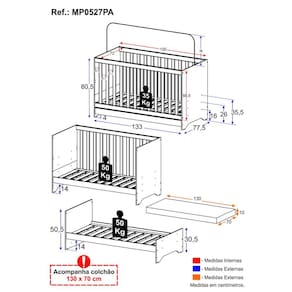 Dimensões do Produto Montado: Berço - Altura: 80,5cm | Largura: 133cm | Profundidade: 77,5cm Colchão - Altura: 10cm | Largura: 130cm | Profundidade: 70cm *Você pode consultar as medidas detalhadas na imagem técnica do produto.