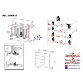 Dimensões do Produto Montado: Berço - Altura: 80,5cm | Largura: 133cm | Profundidade: 77,5cm Cômoda - Altura: 88cm | Largura: 95cm | Profundidade: 42cm *Você pode consultar as medidas detalhadas na imagem técnica do produto.