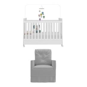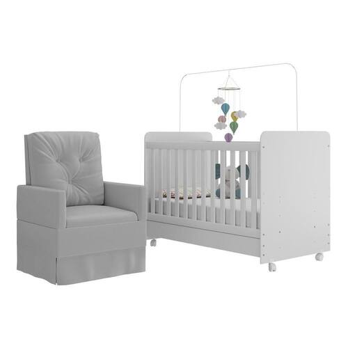 Berço Americano 3x1 Com Colchão Incluso Poltrona De Amamentação Multimóveis Mp4089 Branco/cinza Branco/cinza O Berço Americano 3x1 com Colchão Incluso Poltrona de Amamentação Multimóveis MP4089 foi criado para complementar o quartinho, facilitando a vida da mamãe nos preparativos para a chegada do bebê. O berço é padrão americano (tamanho do colchão 130cm x 70cm) e se transforma em sofá e minicama, o que possibilita ser utilizado por mais tempo. Produzido em MDP com acabamento em pintura UV e Laca PU, que garante maior durabilidade e resistência. O lastro do colchão possui 3 regulagens de altura e acompanha suporte para mosquiteiro, que garante noites mais tranquilas de sono. A grade Soft (PVC) é produzida de maneira ecologicamente correta, com matéria-prima livre de metais pesados, atóxica e com proteção antiamarelamento. Berço certificado pelo INMETRO sob o Selo n 005770/2018. O Colchão D18 (suporta 50kg), que acompanha o berço, é produzido 100% em tecido poliéster com preenchimento em espuma. Possui tratamento anti-ácaro e anti-alérgico e é indicado para crianças de até 3 anos. A poltrona de amamentação é produzida em madeira de eucalipto, com revestimento em tecido veludo, molas reforçadas e mecanismo de balanço, proporcionando muito aconchego. Capaz de suportar 110kg, o assento possui densidade D23, que garante maior conforto e durabilidade. Conteúdo da Embalagem: 1 (um) Berço 1 (um) Colchão 1 (uma) Poltrona Kit Ferragem Manual de Montagem
