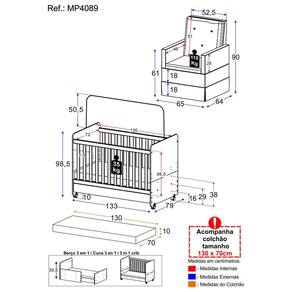 Dimensões do produto montado: Berço - Altura: 98,5cm | Largura: 133cm | Profundidade: 79cm Colchão - Altura: 10cm | Largura: 130cm | Profundidade: 70cm Poltrona - Altura: 90cm | Largura: 65cm | Profundidade: 64cm *Você pode consultar as medidas detalhadas na imagem técnica do produto.
