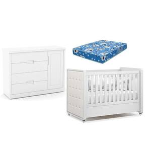 Berço Americano com Capitonê New Boucle e Cômoda Infantil Tutto New Branco Acetinado e Colchão Ortobom - Matic