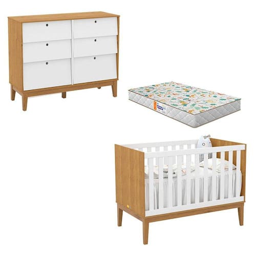 Berço Americano e Cômoda 6 Gavetas Freijó Branco Soft Eco Wood com Colchão Gazin - Matic