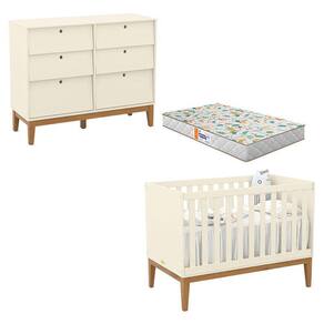 Berço Americano e Cômoda 6 Gavetas Off White Eco Wood com Colchão Gazin - Matic