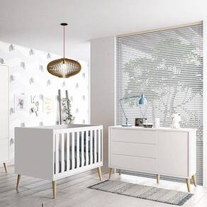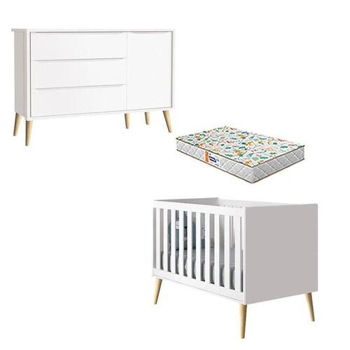 Berço Americano e Cômoda Infantil 1 Porta Theo Branco Pés Madeira Natural com Colchão Gazin Reller