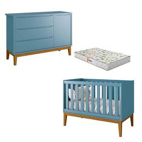 Berço Americano e Cômoda New Classic Azul com Pés Madeira e Colchão Gazin – Reller