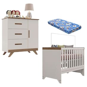 Berço Americano e Cômoda Retro Maya Off White Carvalho com Colchão Ortobom Canaã