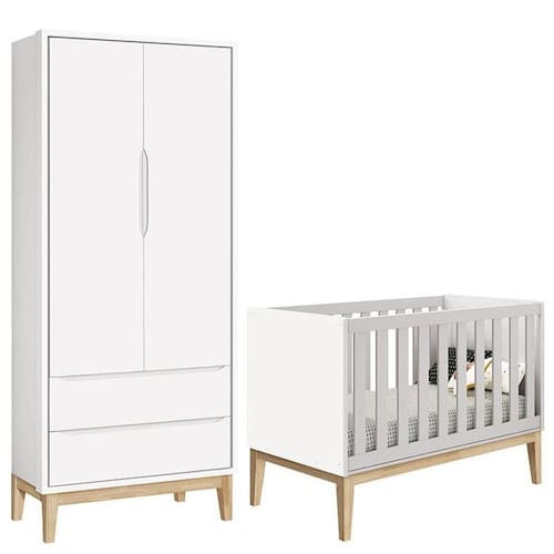 Berço Americano e Guarda Roupa Classic 2 Portas Branco com Pés Madeira Natural Reller