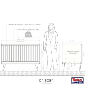 Características: - Produto em: MDP de 15 e 25 mm e MDF de 6 mm - Indicado para colchões: 70x130 cm -não incluso- - Não acompanha suporte para mosquiteiro - 04 pés formato cônico em madeira de 25 mm - Acabamento pintura: Nogal é Fosco e o Branco é Brilho - Suporte de peso 50 kg - Grade fixa - Possui 3 posições de estrado - Garantia de 12 meses