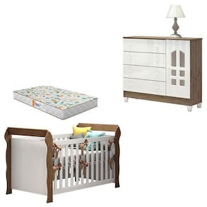 Berço Americano Lara e Cômoda Selena Branco Acetinado Amadeirado com Colchão Gazin Carolina
