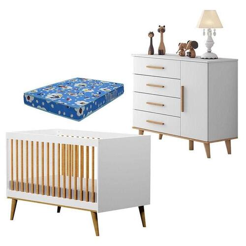Berço Americano Ligia e Cômoda Ludmila Branco Acetinado Bétula com Colchão Ortobom - Carolina Móveis