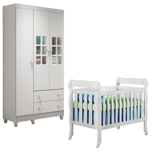Berço Americano Lila e Guarda Roupa Mariah 3 Portas Branco Brilho – Carolina