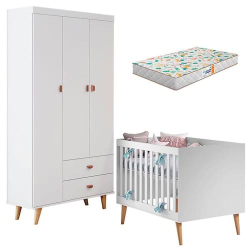 Os móveis para o quarto do bebê estão aqui! Apresentamos a vocês esse lindo conjunto composto por Berço Americano da linha Ludmila que se transforma em mini cama e sofá cama aumentando a vida útil do móvel acompanhando as fases de crescimento da criança, e o Guarda Roupa Infantil 3 Portas da linha Duda que conta com amplo espaço interno para maior praticidade e organização das roupinhas, sapatinhos e acessórios do bebê, possui sistema de Travas Anti-Tombamento fixados na parede para segurança de todos evitando acidentes, desenvolvidos pela Carolina Baby com todo amor, carinho e cuidado para esse momento tão especial da vida, conta um lindo design na cor Branco Acetinado proporcionando conforto, modernidade e tranquilidade ao ambiente com Pés estilo Retrô na cor Bétula, fabricado com materiais de alta qualidade, resistência e durabilidade sem deixar a delicadeza de lado e ainda acompanha Colchão da Gazin. Confira abaixo as características, aproveite e garanta o seu!