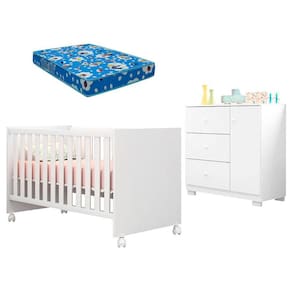 A mamãe está procurando móveis para montar o quartinho do seu bebê? Então apresentamos para você este belo conjunto composto pelo berço americano da linha Doce Sonho 100 fabricado pela Qmovi acompanhado do colchão Ortobom e a cômoda infantil da linha Duda fabricado pela Phoenix Baby. O berço oferece a opção de acompanhar o crescimento do seu filho, se tornando uma mini cama. A cômoda possui três gavetas e uma porta, ideal para a mamãe acomodar as roupinhas e acessórios do seu filho. Desenvolvidos em MDP/ MDF da mais alta qualidade, garante durabilidade e resistência. Esse conjunto agrega sofisticação e conforto para o bebê. Além disso, foi cuidadosamente projetado para acompanhar todas as fases de crescimento do seu filho. Confira as características: