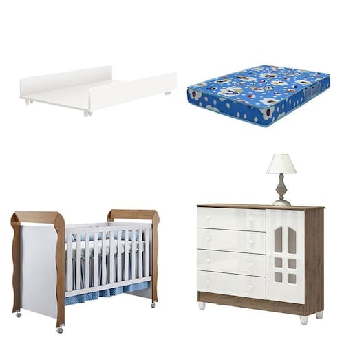 Com a chegada do bebê, é preciso escolher móveis de qualidade para montar o quartinho. Pensando nisso preparamos para a mamãe várias opções de produtos para deixar o ambiente aconchegante e moderno. Berço Americano Mirelle na cor Branco Acetinado Amadeirado que transforma - se em Mini Cama aumentando a vida útil do Móvel. Cômoda Selena possui 1 Porta com Prateleira 4 Gavetas e um lindo design deixando o ambiente mais sofisticado. Trocador Juju fabricado pela Reller, pensado para oferecer mais conforto para a mamãe e o bebê evitando dores nas costas e ainda acompanha um lindo colchão Ortobom, oferecendo conforto nas noites de sono do bebê. Veja mais detalhes desses produtos e aproveite nossos precinhos!