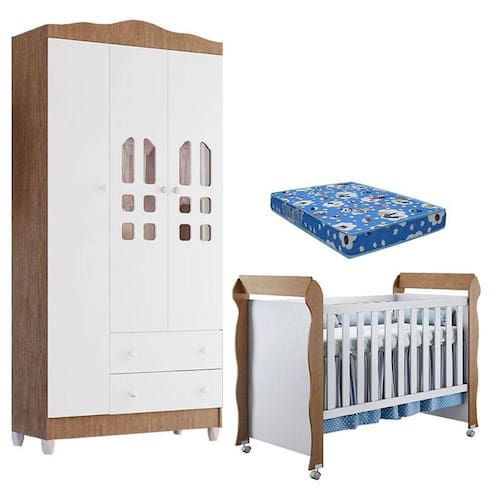 Berço Americano Mirelle e Guarda Roupa New Selena 3 Portas Branco Acetinado Amadeirado com Colchão Ortobom – Carolina Móveis