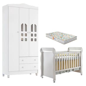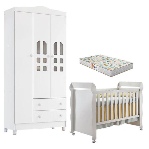 Berço Americano Mirelle e Guarda Roupa New Selena 3 Portas Branco Brilho com Colchão Gazin – Carolina Móveis